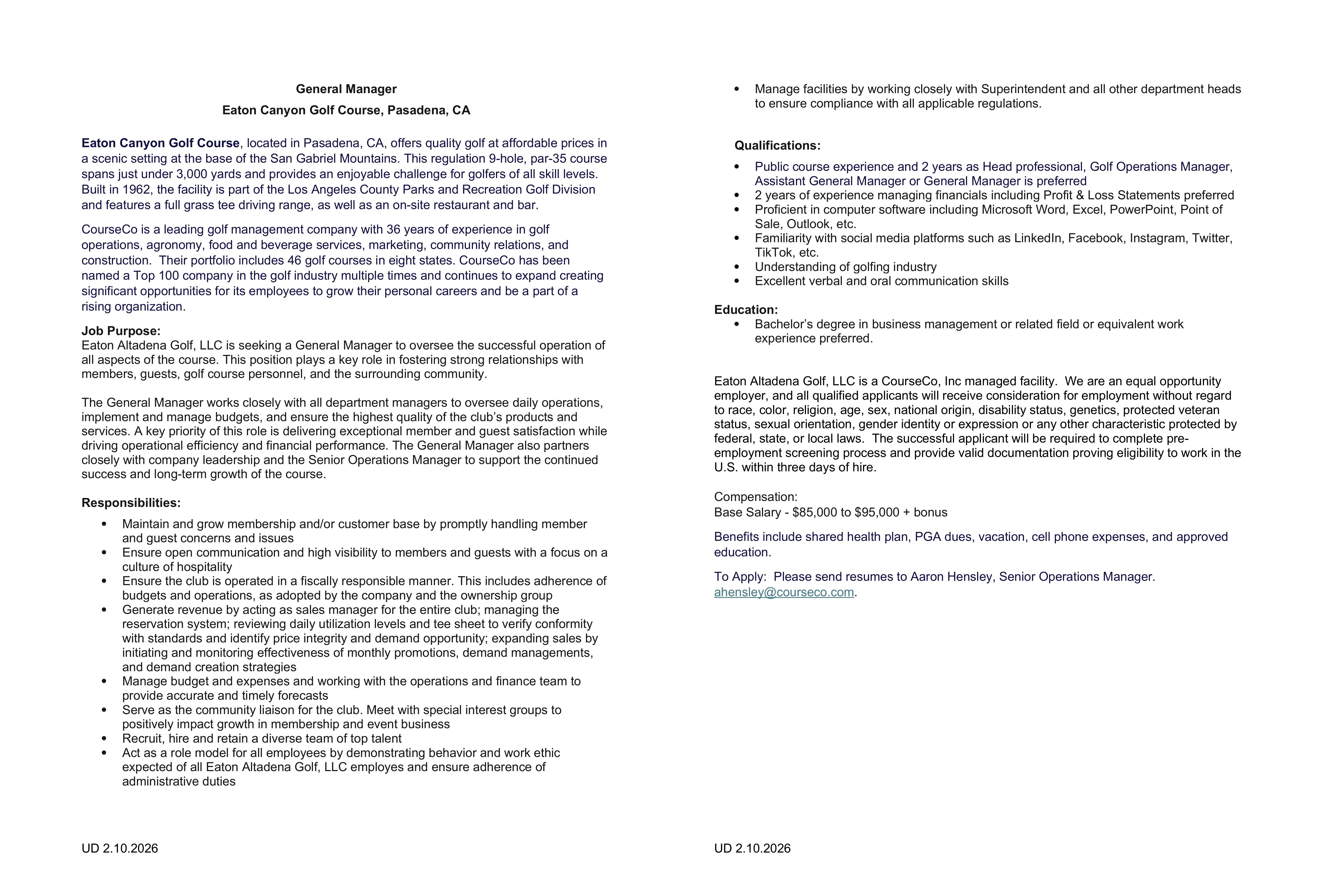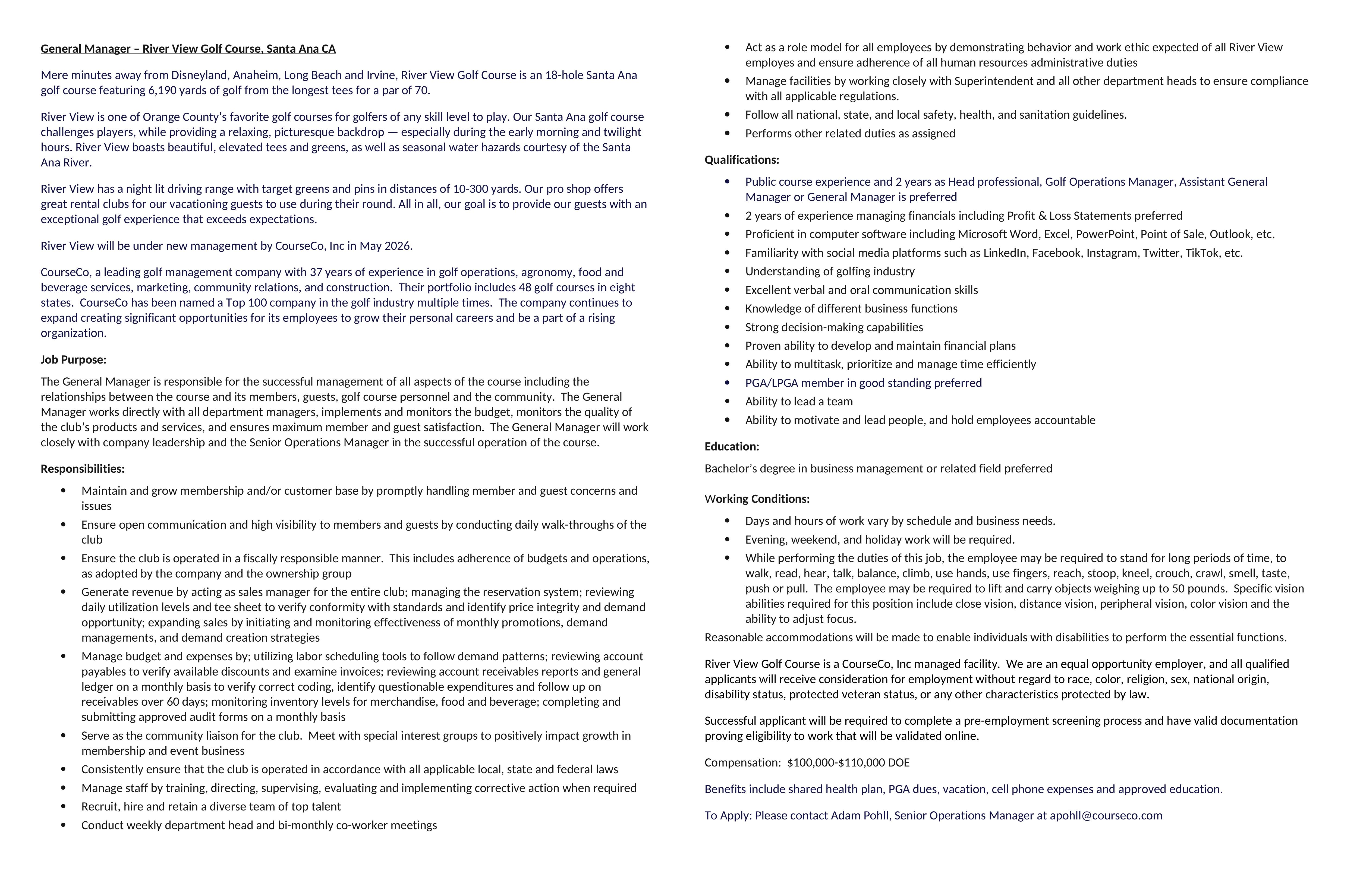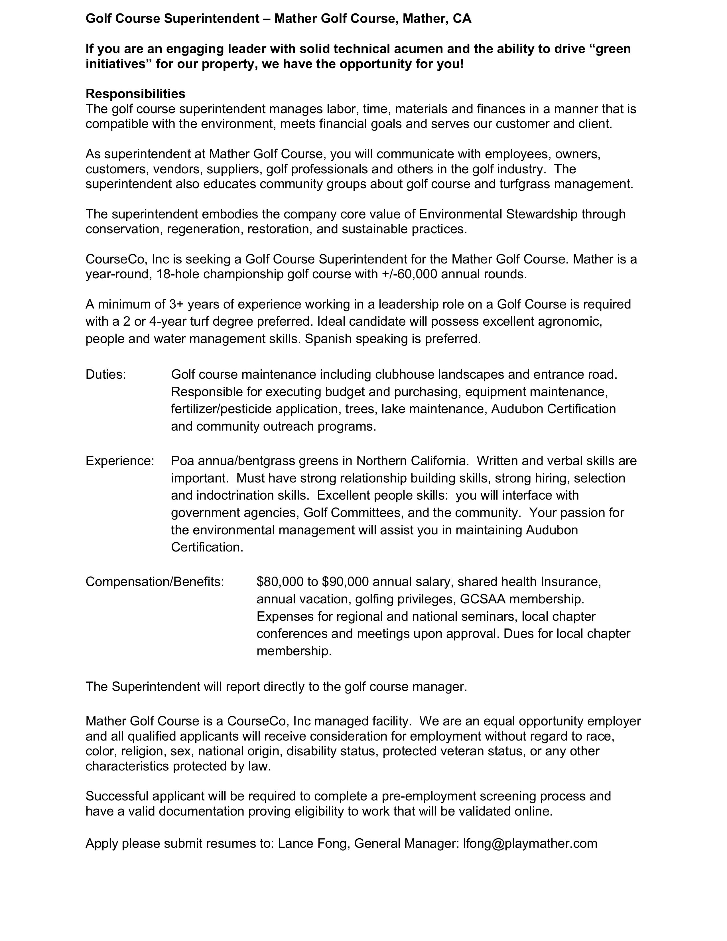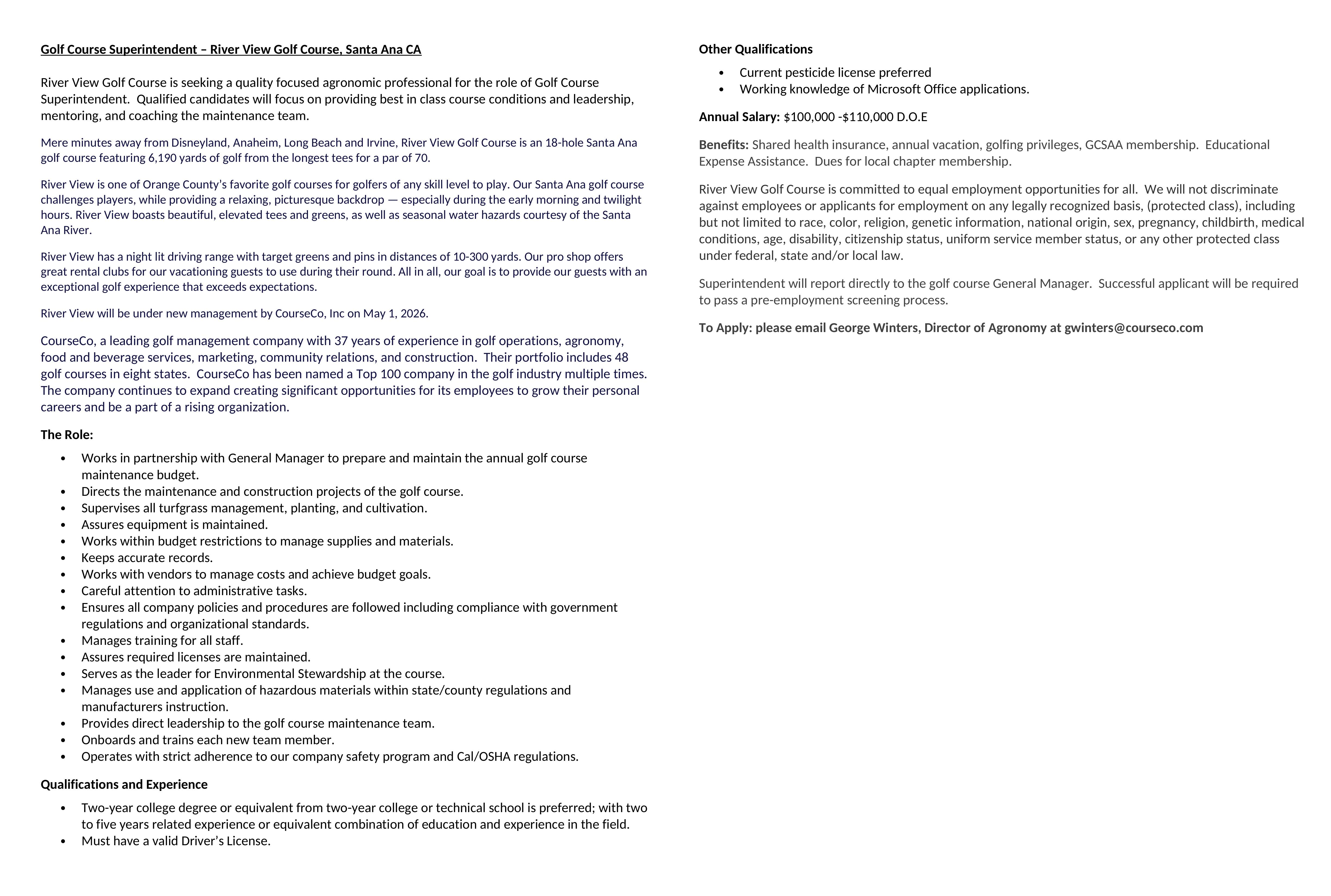 Mather Golf Course – Golf Course Superintendent Eaton Canyon Golf Course – Golf Course General Manager River View Golf Course – Golf Course General Manager River View Golf Course – Golf Course Superintendent